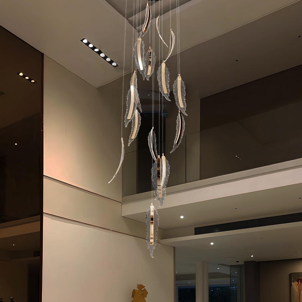 Graceful and splendid, Feather Leaf Double Height LED Chandelier Smart Voice Assist Chandelier is an elegant lighting fixture with an impeccable appearance